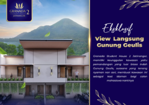 Kosan yang dirancang dengan mengusung gaya modern Tropis yang menyatu dengan suasana lingkungan hijau dan asri, dengan Luas Kamar minimum 9 m2 yang dimana setiap kamar terdapat jendela. Di area kosan terdapat fasilitas pantry bersama, area bersama, laundry, tanah belakang, dan balkon. Ini dapat menciptakan suasana yang nyaman sekaligus menarik, cocok untuk mahasiswa dan pekerja muda. Di rukost Granada Student House 2 Jatinangor ini penghuni di suguhkan view gunung geulis yang asri dan fasilitas Proper untuk tempat tinggal yang nyaman.
