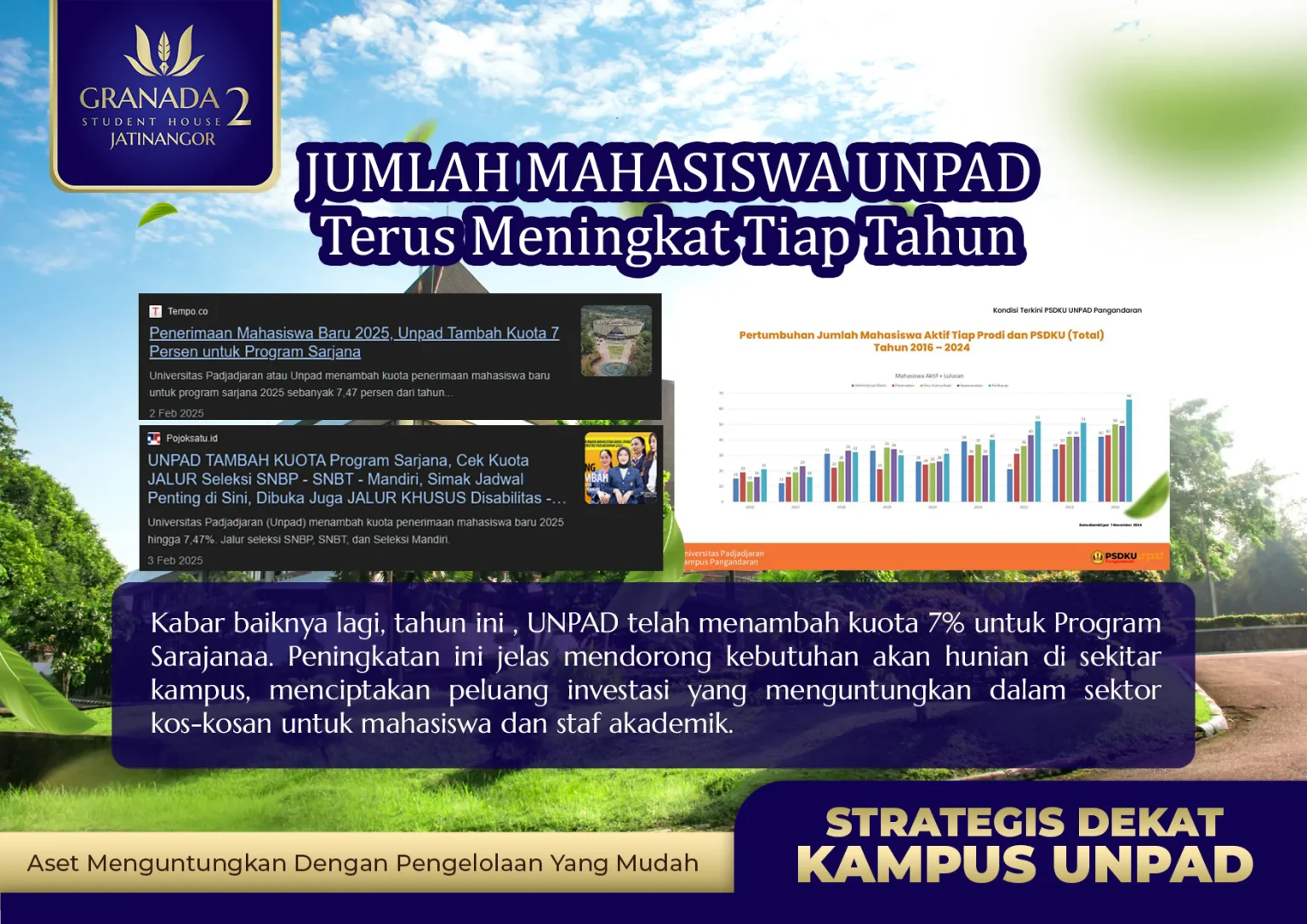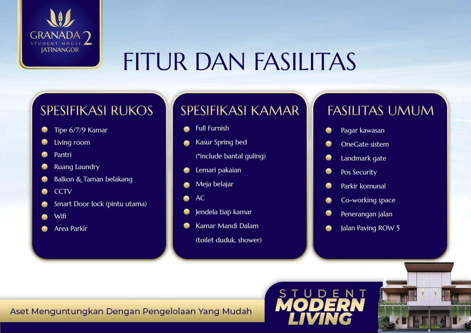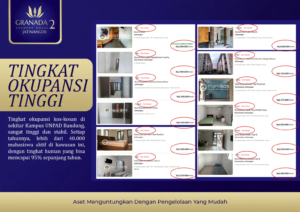 Granada Student House 2 menawarkan aset investasi yang aman, mudah, dan menjanjikan berupa RUKOS (Rumah Kost) Eksklusif yang berlokasi sangat dekat dengan kampus UNPAD, yang artinya akan menyerap banyak mahasiswa baru yang menginginkan tempat tinggal nyaman dan strategis.