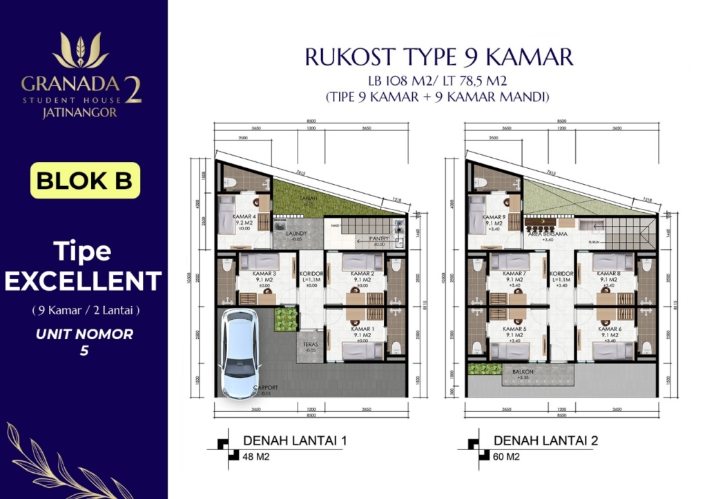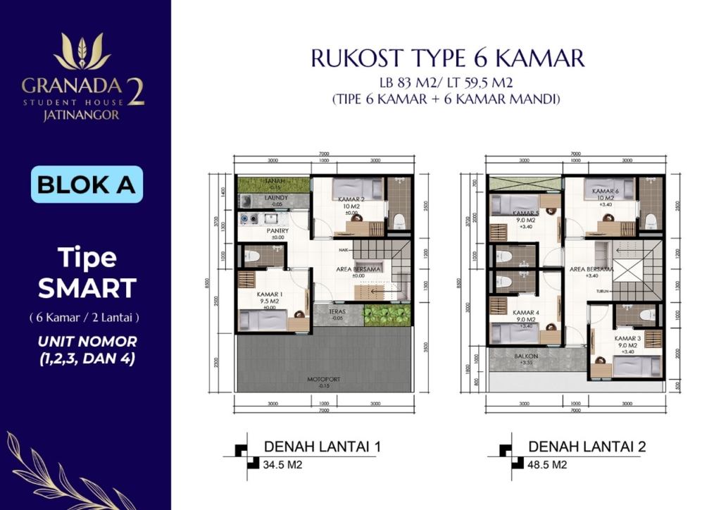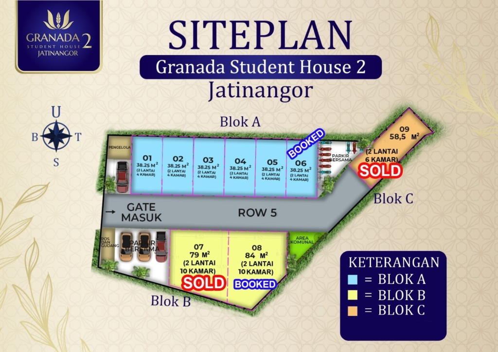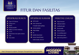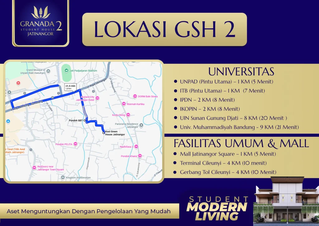 Granada Student House 2 (Jatinangor) adalah solusi investasi aman, mudah, dan menjanjikan berupa RUKOS eksklusif dengan lokasi strategis hanya 1 KM atau 5 menit dari Universitas Padjadjaran (UNPAD) dan Institut Teknologi Bandung (ITB). Dengan potensi okupansi tinggi dari ribuan mahasiswa aktif, hunian ini dirancang dengan konsep kost modern full furnish, fasilitas lengkap, akses mudah ke berbagai sarana umum, serta lingkungan yang nyaman dan berkembang.